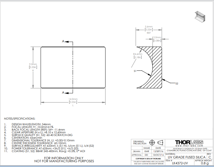 Thorlabs索雷博 LK4372-UV 平凹柱面透镜