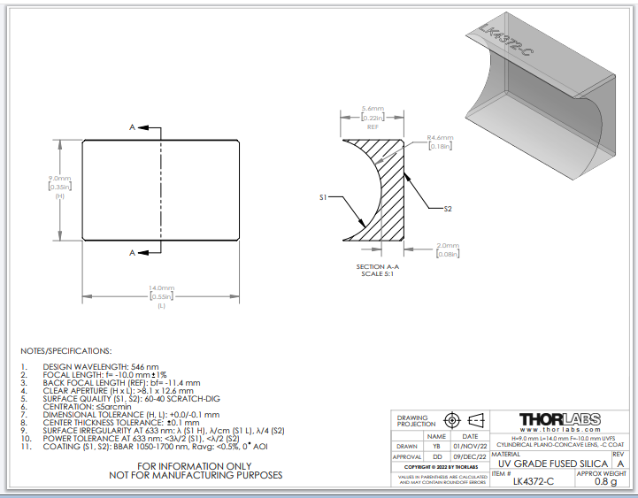 Thorlabs索雷博 LK4372-C 平凹柱面透镜