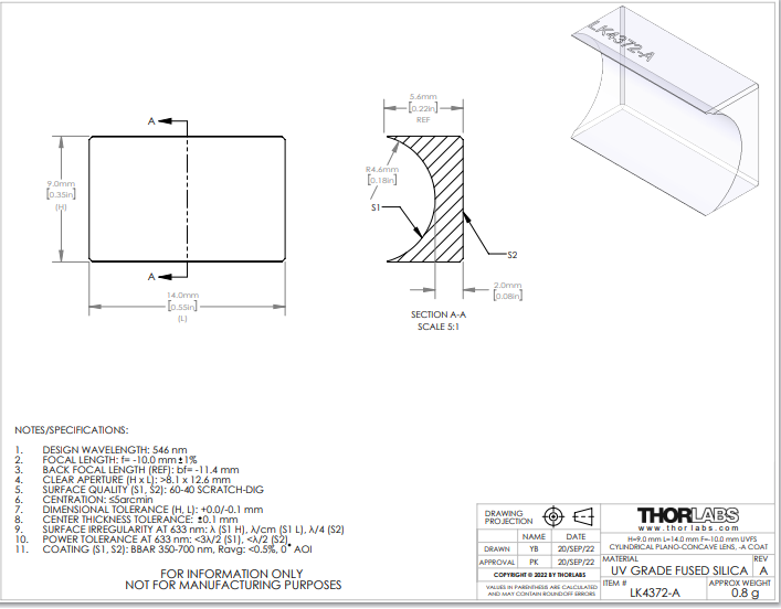 Thorlabs索雷博     LK4372-A   平凹柱面透镜