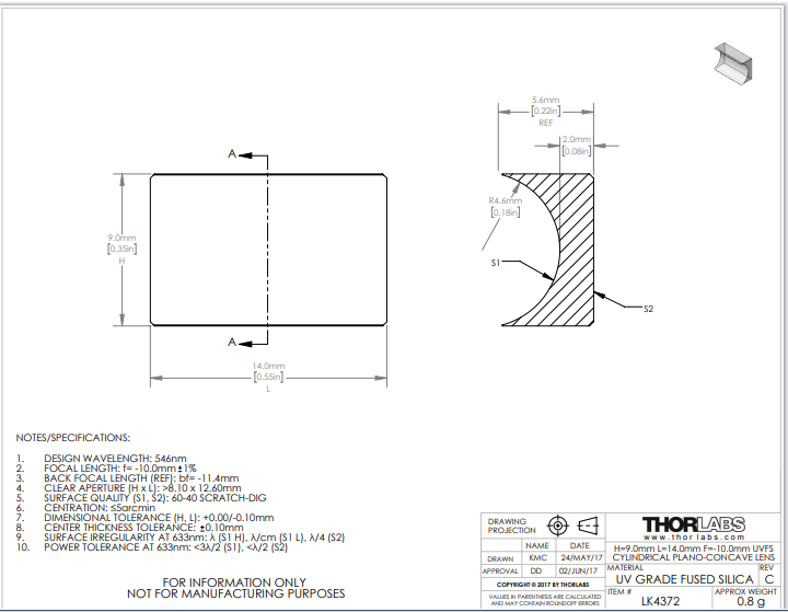Thorlabs索雷博 LK4372 平凹柱面透镜