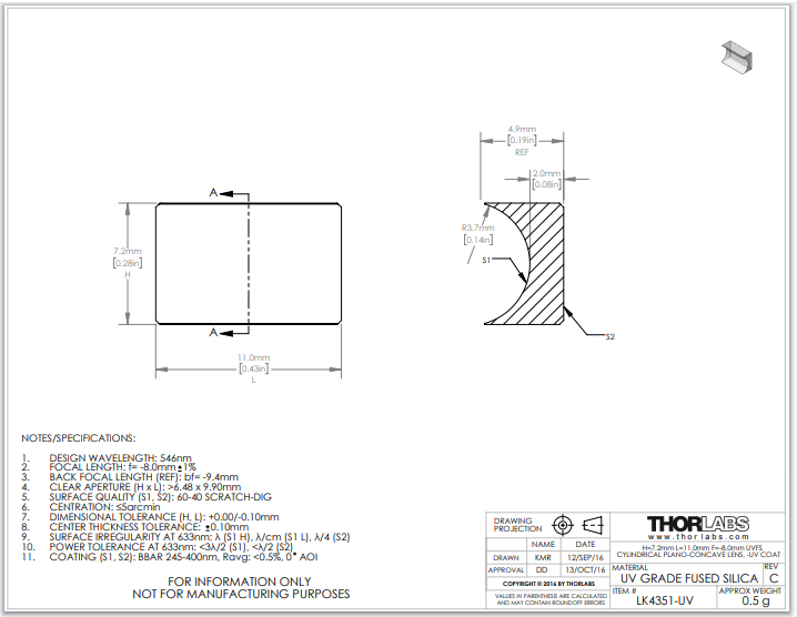 Thorlabs索雷博     LK4351-UV   平凹柱面透镜