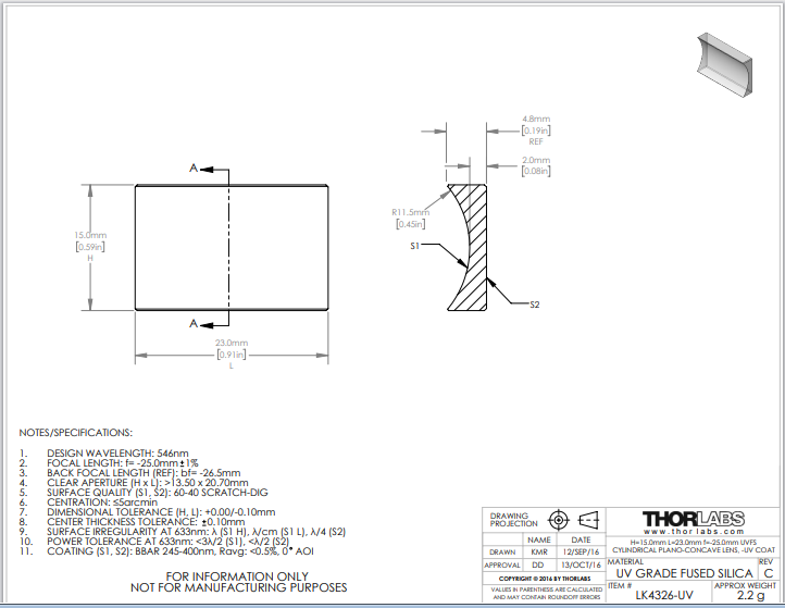 Thorlabs索雷博 LK4326-UV 平凹柱面透镜