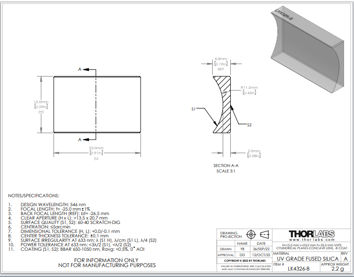 Thorlabs索雷博     LK4326-B   平凹柱面透镜