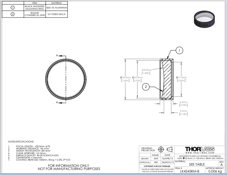 Thorlabs索雷博 LK4245RM-B 平凹圆形柱面透镜