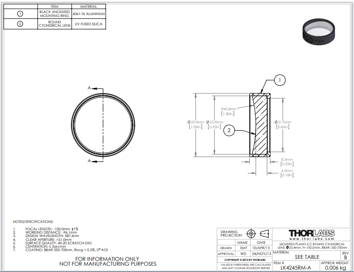 Thorlabs索雷博     LK4245RM-A   平凹圆形柱面透镜