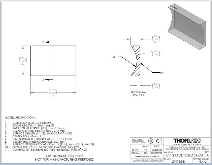 Thorlabs索雷博     LK4166-B   平凹柱面透镜