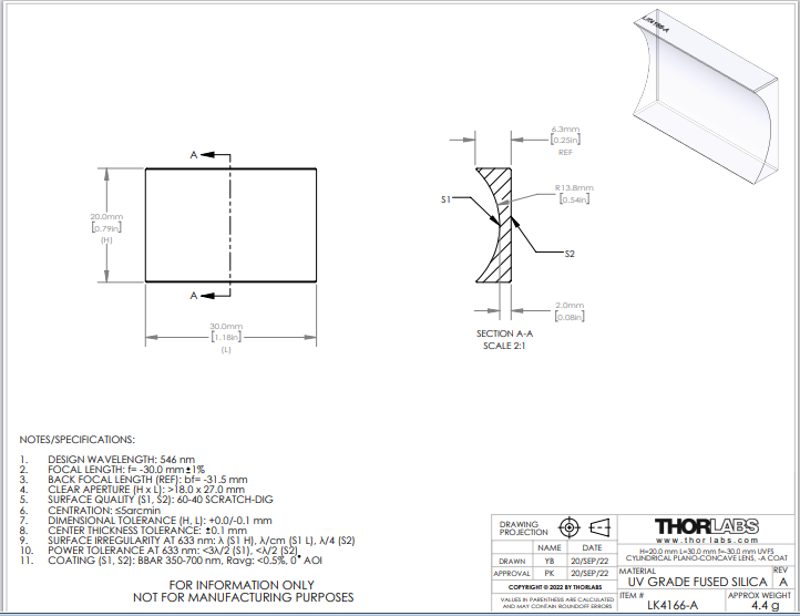 Thorlabs索雷博     LK4166-A   平凹柱面透镜