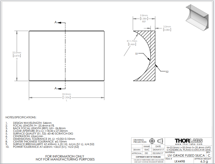 Thorlabs索雷博 LK4498 平凹柱面透镜