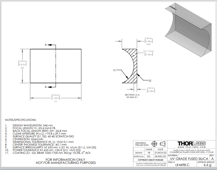 Thorlabs索雷博 LK4498-C 平凹柱面透镜