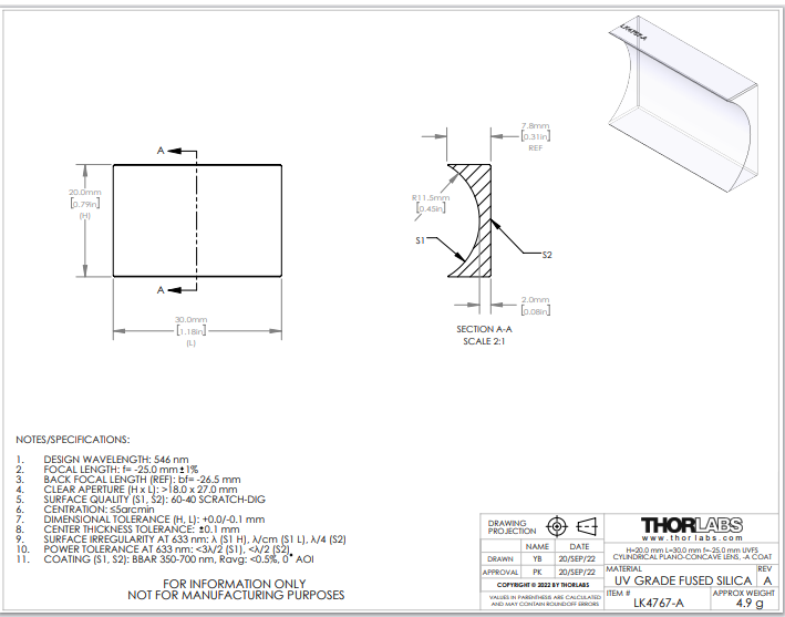 Thorlabs索雷博 LK4767-A 平凹柱面透镜