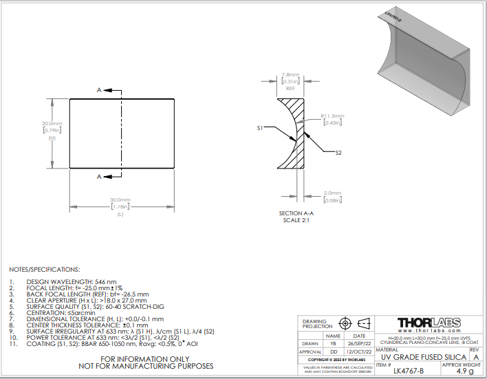 Thorlabs索雷博 LK4767-B 平凹柱面透镜