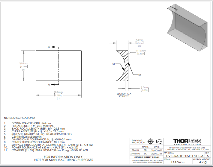 Thorlabs索雷博     LK4767-C   平凹柱面透镜
