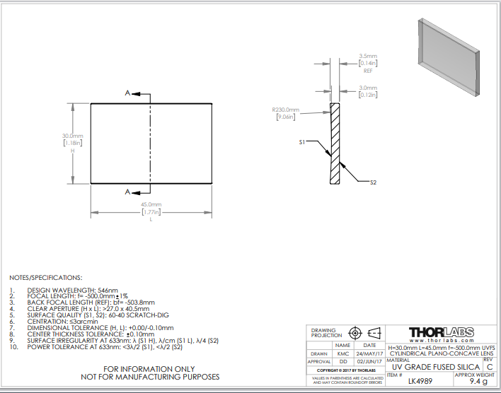 Thorlabs索雷博 LK4989 平凹柱面透镜