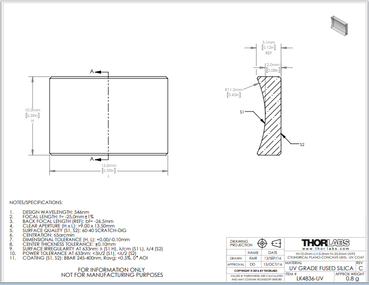 Thorlabs索雷博 LK4836-UV 平凹柱面透镜