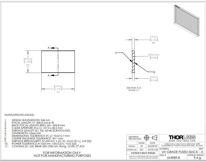 Thorlabs索雷博     LK4989-B   平凹柱面透镜
