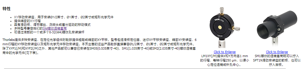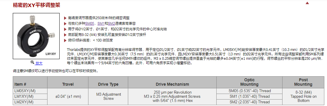 Thorlabs索雷博 LM1XY - 用于Ø1英寸光学元件的移动透镜安装座