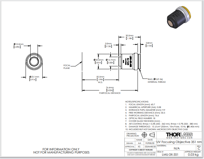 Thorlabs索雷博     LMU-3X-351 - MicroSpot聚焦物镜