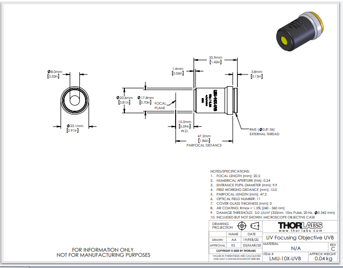Thorlabs索雷博 LMU-10X-UVB - MicroSpot聚焦物镜