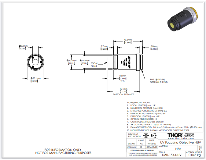 Thorlabs索雷博 LMU-15X-NUV - MicroSpot聚焦物镜