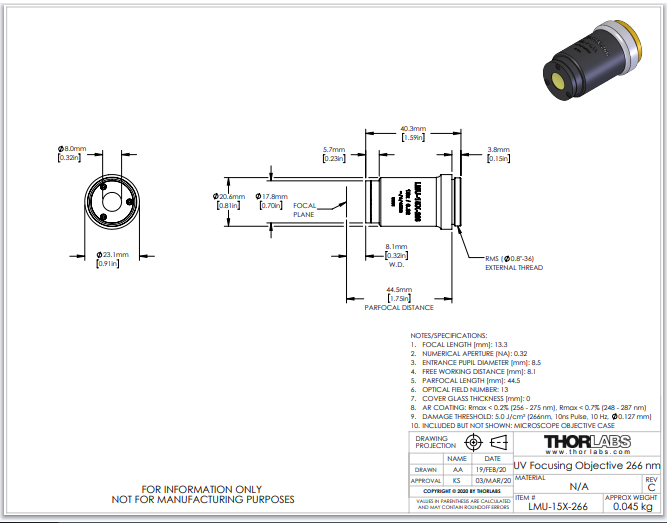 Thorlabs索雷博 LMU-15X-266 - MicroSpot聚焦物镜