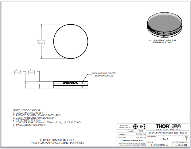 Thorlabs索雷博 LPIREA050-C - Ø1/2英寸线偏振片