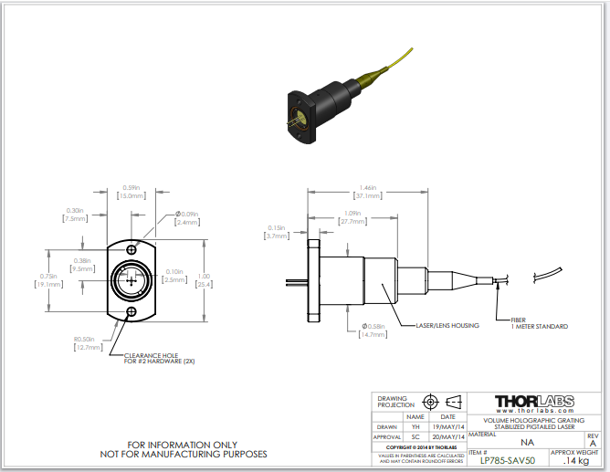 Thorlabs索雷博 LP785-SAV50 - 体全息光栅波长稳定型激光二极管