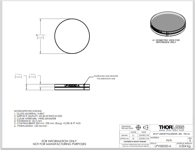 Thorlabs索雷博     LPVISE050-A - Ø1/2英寸线偏振片