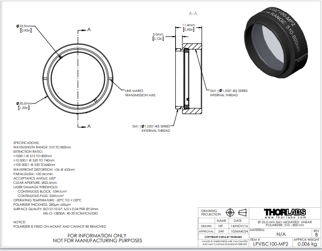 Thorlabs索雷博 LPVISC100-MP2 - 线偏振片