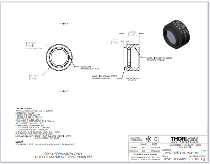 Thorlabs索雷博 LPVISC050-MP2 - 线偏振片