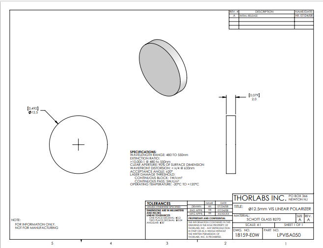 Thorlabs索雷博     LPVISA050 - 线偏振片