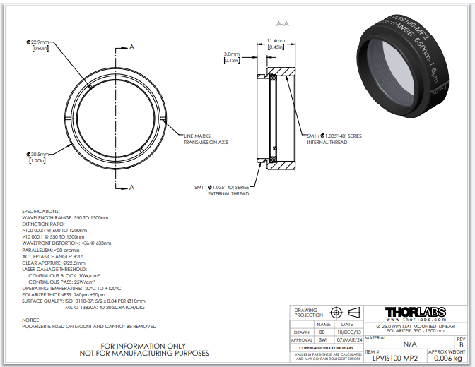 Thorlabs索雷博     LPVIS100-MP2 - 线偏振片