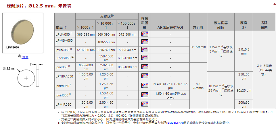 LPUV、LPVISA、LPVISC和LPVIS都是由两片折射率匹配的肖特玻璃夹着一块线偏振片的未安装结构,以增加强度;安装这些夹层偏振片时必须小心,因为过度的机械应力会显着降低消光比。