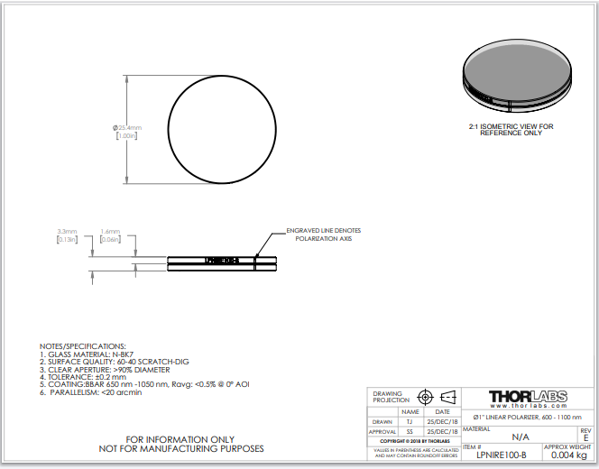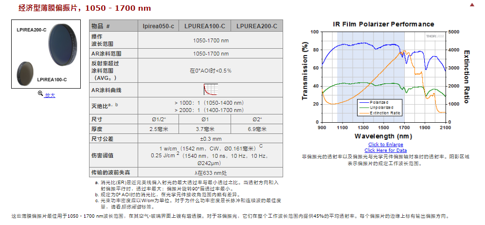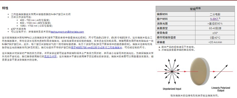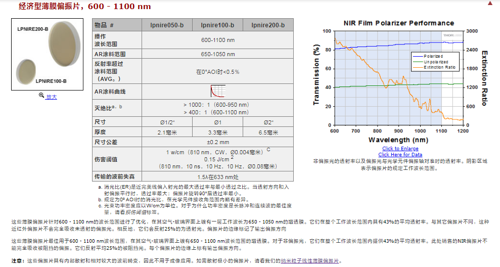 Thorlabs索雷博 LPNIRE100-B - Ø1英寸线偏振片
