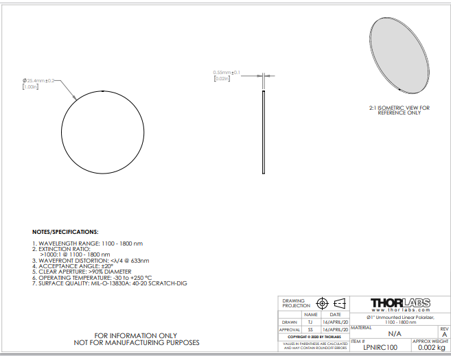 Thorlabs索雷博 LPNIRC100 - 线偏振片
