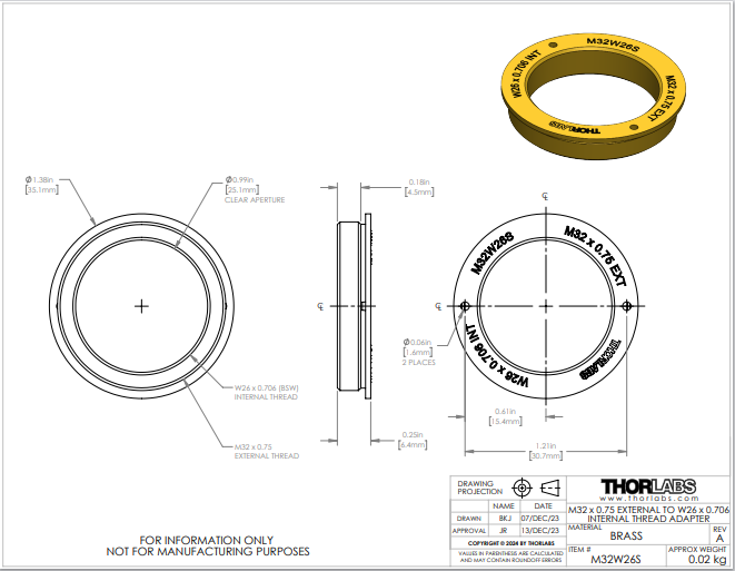 Thorlabs索雷博     M32W26S - 黄铜显微镜转接件