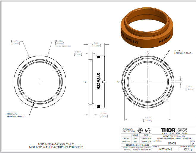 Thorlabs索雷博 M32M34S - 黄铜显微镜转接件
