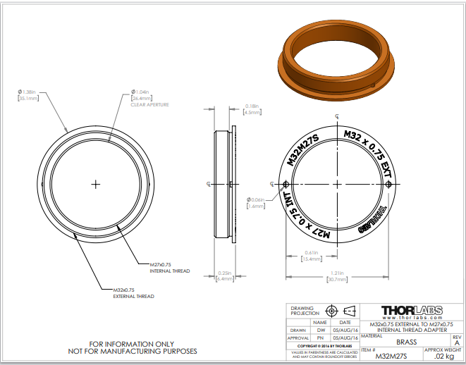 Thorlabs索雷博     M32M27S - 黄铜显微镜转接件