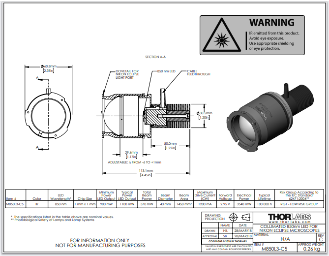 Thorlabs索雷博 M850L3-C5 - 准直LED