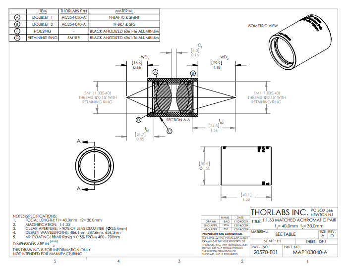 Thorlabs索雷博     MAP103040-A   匹配消色差透镜对