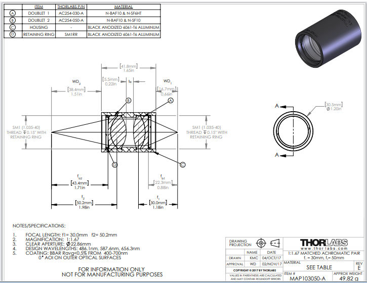 Thorlabs索雷博 MAP103050-A 匹配消色差透镜对