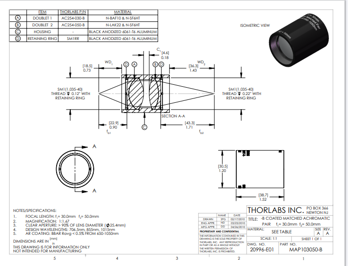 Thorlabs索雷博 MAP103050-B 匹配消色差双胶合透镜对