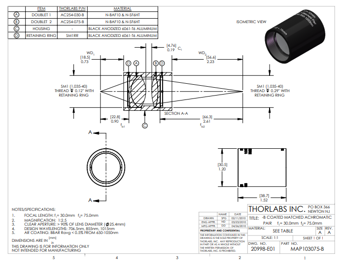 Thorlabs索雷博 MAP103075-B 匹配消色差双胶合透镜对