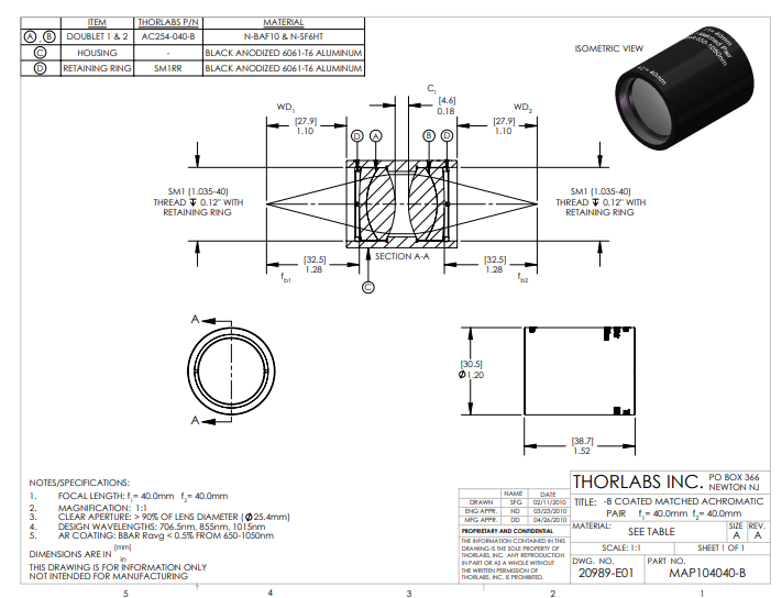 Thorlabs索雷博 MAP104040-B 匹配消色差双胶合透镜对