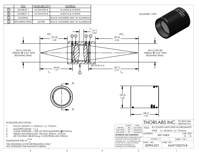Thorlabs索雷博     MAP105075-B   匹配消色差双胶合透镜对