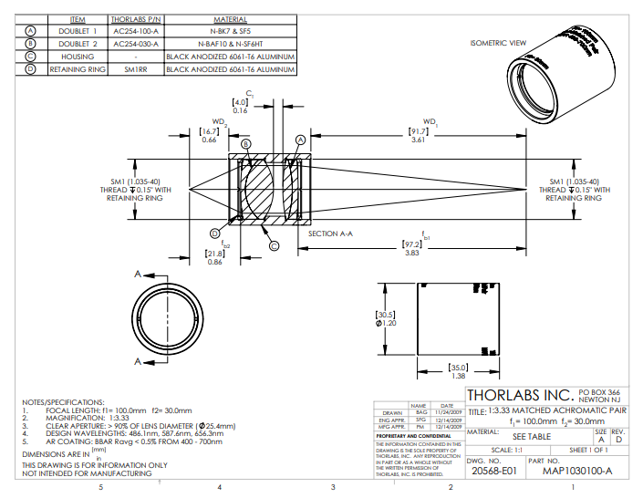 Thorlabs索雷博 MAP1030100-A 匹配消色差透镜对