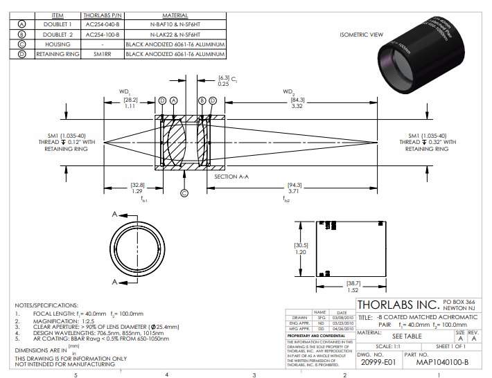 Thorlabs索雷博 MAP1040100-B 匹配消色差双胶合透镜对