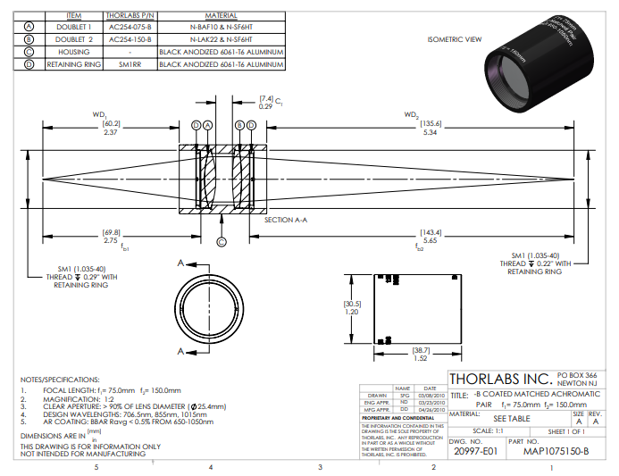 Thorlabs索雷博 MAP1075150-B 匹配消色差双胶合透镜对