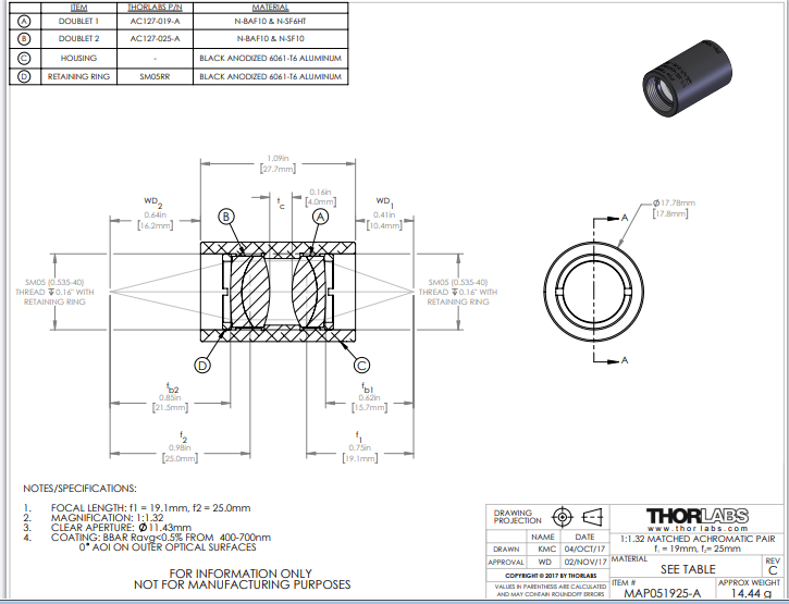 Thorlabs索雷博 MAP051925-A 匹配消色差透镜对