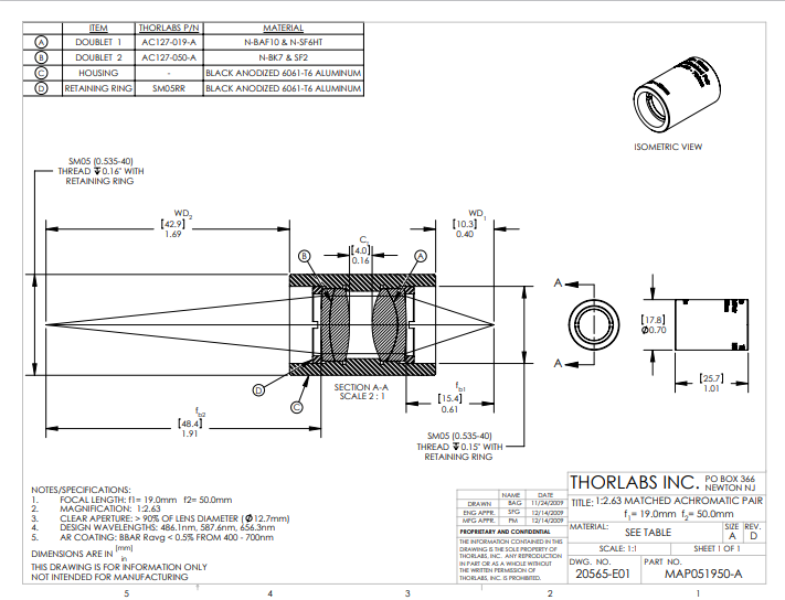 Thorlabs索雷博 MAP051950-A 匹配消色差透镜对
