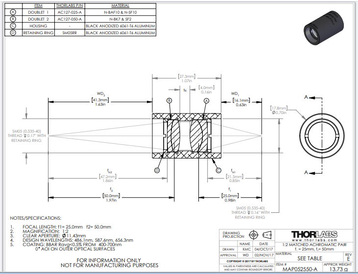 Thorlabs索雷博 MAP052550-A 匹配消色差透镜对